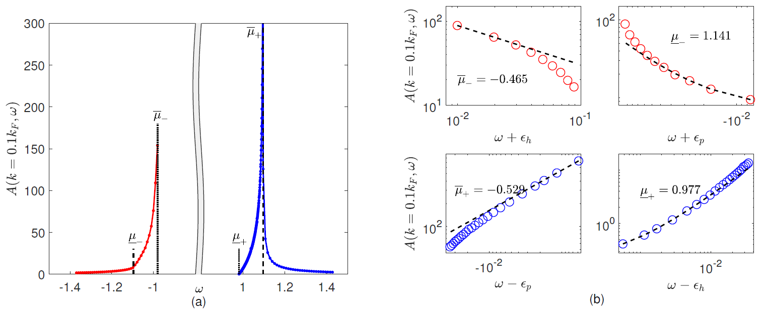 (a) 中等强度(γ=4.0)下, k=0.1kF的谱函数随能量变化的曲线。黑色虚线和点线分别标示了I型和II型激发谱的边界;(b) 谱函数在四个边界附近的幂律行为。红色和蓝色圆圈表示计算结果,黑色虚线代表拟合的幂律曲线。